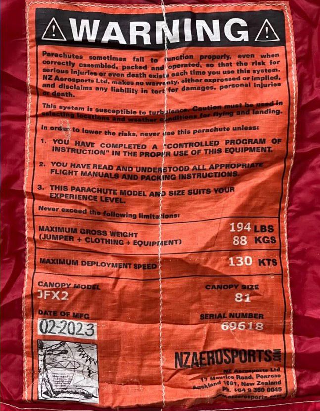 The JYRO JFX 2 (also known as the NZ Aerosports JFX 2 is a high-performance, 21-cell crossbraced skydiving canopy designed for experienced pilots transitioning into swooping.