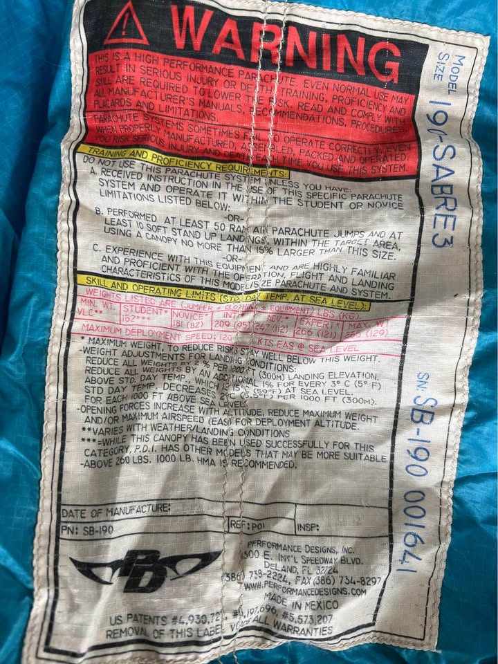 The Performance Designs Sabre3 190 is a semi-elliptical 9-cell skydiving canopy designed for a wide range of experience levels, from novice to expert.